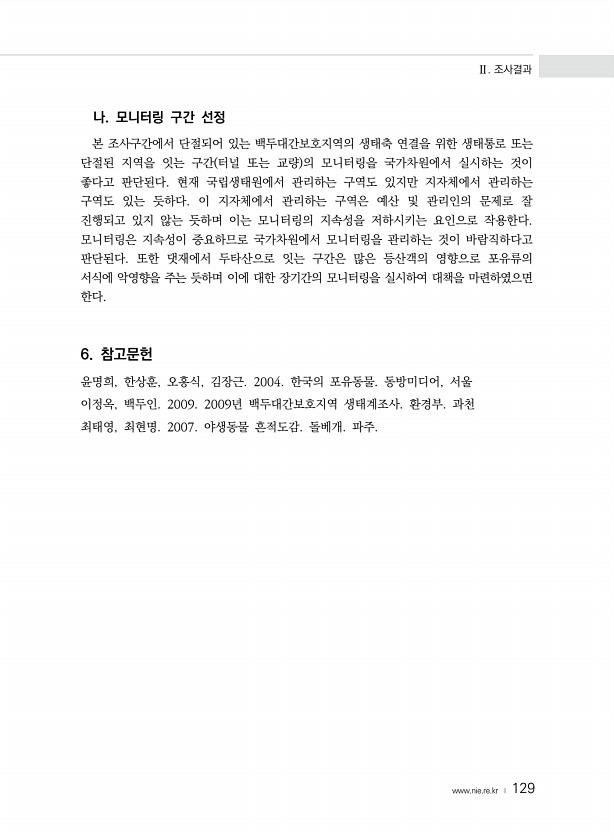 Ⅱ. 조사결과 www.nie.re.kr ? 129 나. 모니터링 구간 선정 본 조사구간에서 단절되어 있는 백두대간보호지역의 생태축 연결을 위한 생태통로 또는 단절된 지역을 잇는 구간 터널 또는 교량 의 모니터링을 국가차원에서 실시하는 것이 좋다고 판단된다. 현재 국립생태원에서 관리하는 구역도 있지만 지자체에서 관리하는 구역도 있는 듯하다. 이 지자체에서 관리하는 구역은 예산 및 관리인의 문제로 잘 진행되고 있지 않는 듯하며 이는 모니터링의 지속성을 저하시키는 요인으로 작용한다. 모니터링은 지속성이 중요하므로 국가차원에서 모니터링을 관리하는 것이 바람직하다고 판단된다. 또한 댓재에서 두타산으로 잇는 구간은 많은 등산객의 영향으로 포유류의 서식에 악영향을 주는 듯하며 이에 대한 장기간의 모니터링을 실시하여 대책...