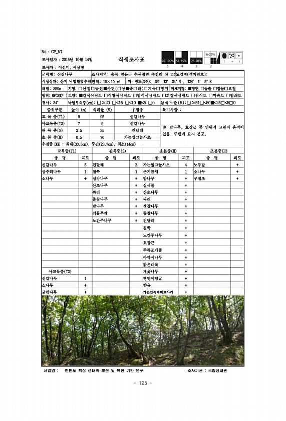 125 No CP_N7 조사일자 2015년 10월 14일 조사자 이선미, 서상령 식생조사표 군락명신갈나무 조사지역충북 영동군 추풍령면 죽전리 산 112도엽명 격자번호 식생상관산지 낙엽활엽수림면적10×10 ㎡ 위·경도 GPS 36° 12′ 34″N , 128° 1′ 5″E 해발350m 지형□산정□능선■사면 □상■중□하 □계곡□평지 미세지형■평면 □돌출 □함몰□요철 방위NW 330° 토양■갈색삼림토 □적황색삼림토 □암적색삼림토 □회갈색삼림토 □침식토 □미숙토 □암쇄토 경사34° 낙엽부식층 cm □≥20 □ 15 □ 10 ■ 5 □0 암석노 출 % □≥51□ 50■ 25□ 5□0 층위구분 높이 m 식피율 % 우점종 특기사항 교 목 층 T1 9 95 신갈나무 ※ 밤나무, 호장근 등 인위적 교란의 흔적이 있음. 주변...