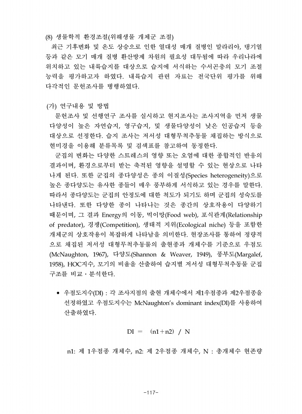 -117- 생물학적 환경조절 위해생물 개체군 조절 최근 기후변화 및 온도 상승으로 인한 열대성 매개 질병인 말라리아 댕기열 등과 같은 모기 매개 질병 환산방제 차원의 필요성 대두됨에 따라 우리나라에 위치하고 있는 내륙습지를 대상으로 습지에 서식하는 수서곤충의 모기 조절 능력을 평가하고자 하였다 내륙습지 관련 자료는 전국단위 평가를 위해 다각적인 문헌조사를 병행하였다 가 연구내용 및 방법 문헌조사 및 선행연구 조사를 실시하고 현지조사는 조사지역을 먼저 생물 다양성이 높은 자연습지 영구습지 및 생물다양성이 낮은 인공습지 등을 대상으로 선정한다 습지 조사는 저서성 대형무척추동물 채집하는 방식으로 현미경을 이용해 분류목록 및 검색표를 참고하여 동정한다 군집의 변화는 다양한 스트레스의 영향 또는 오염에 대한 종합적인...
