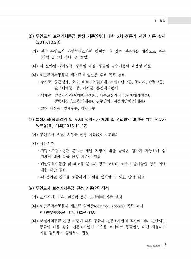Ⅰ. 총괄 www.nie.re.kr ? 5 6 무인도서 보전가치등급 판정 기준 안 에 대한 2차 전문가 서면 자문 실시 2015.10.23 가 전국 무인도서 자연환경조사에 참여한 바 있는 전문가를 대상으로 자문 지형 등 6개 분야, 총 27명 나 각 분야별 평가항목, 항목별 배점, 등급별 점수기준의 적정성 자문 다 해안무척추동물과 해조류의 일반종 후보 목록 검토 ㆍ추가종둥근성게, 소라, 비로도복털조개, 서해비단고둥, 동다리, 탑뿔고둥, 갈색띠매물고둥, 가시굴, 홍점갯지렁이 ㆍ삭제종별불가사리 위해해양생물 , 아무르불가사리 위해해양생물 , 뚱뚱이짚신고둥 외래종 , 진주담치, 지중해담치 외래종 ㆍ고려 대상종옆새우류, 참털군부 7 특정지역 생태?경관 및 도서 정밀조사 체계 및 관리방안 마련을 위한 전문가 워크숍 Ⅱ...