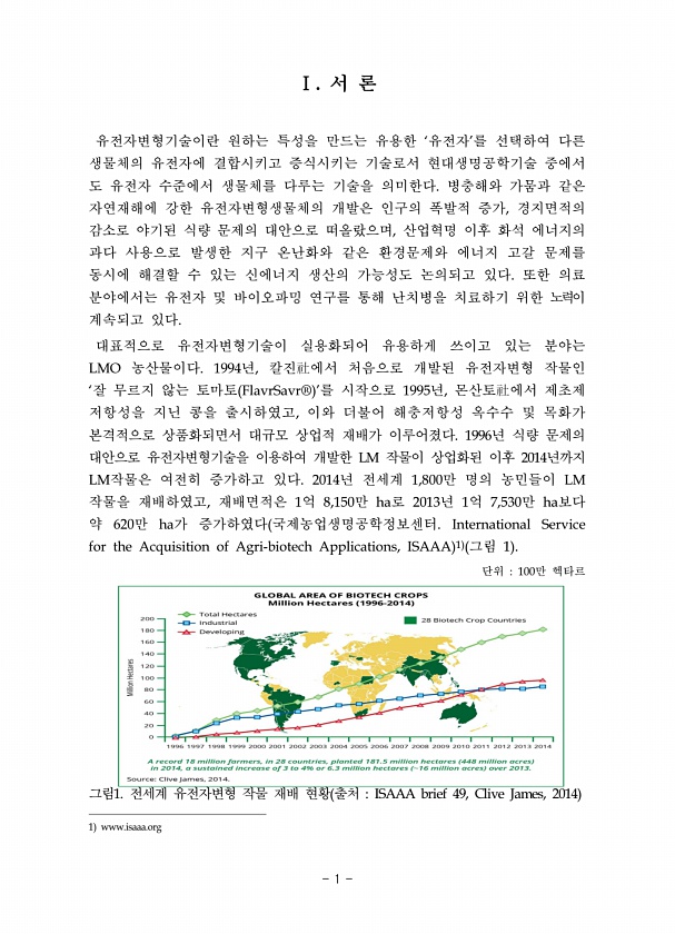 Ⅰ. 서 론 유전자변형기술이란 원하는 특성을 만드는 유용한 ‘유전자’를 선택하여 다른 생물체의 유전자에 결합시키고 증식시키는 기술로서 현대생명공학기술 중에서 도 유전자 수준에서 생물체를 다루는 기술을 의미한다. 병충해와 가뭄과 같은 자연재해에 강한 유전자변형생물체의 개발은 인구의 폭발적 증가, 경지면적의 감소로 야기된 식량 문제의 대안으로 떠올랐으며, 산업혁명 이후 화석 에너지의 과다 사용으로 발생한 지구 온난화와 같은 환경문제와 에너지 고갈 문제를 동시에 해결할 수 있는 신에너지 생산의 가능성도 논의되고 있다. 또한 의료 분야에서는 유전자 및 바이오파밍 연구를 통해 난치병을 치료하기 위한 노력이 계속되고 있다. 대표적으로 유전자변형기술이 실용화되어 유용하게 쓰이고 있는 분야는 LMO 농산물이다. 1994년...