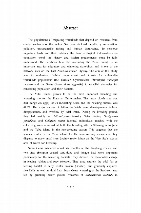 ix Abstract The populations of migrating waterbirds that depend on resources from coastal wetlands of the Yellow Sea have declined rapidly by reclamation, pollution, unsustainable fishing and human disturbance. To conserve migratory birds and their habitats, the basic ecological imformations on population trend, life history and habitat requirements must be fully understood. The Seocheon tidal fla...