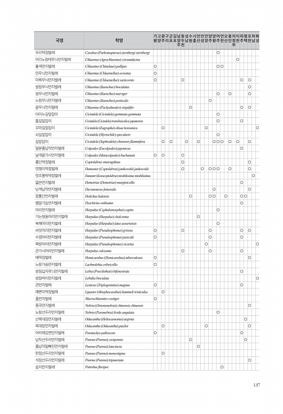 137 우리딱정벌레 Carabus Parhomopterus sternbergi sternbergi ○ 어리노랑테무늬먼지벌레 Chlaenius Agrochlaenius circumductus ○ 풀색먼지벌레 Chlaenius Chinelaus pallipes ○ ○ ○ 민무늬먼지벌레 Chlaenius Chlaeniellus ocreatus ○ 미륵무늬먼지벌레 Chlaenius Chlaeniellus variicornis ○ ○ ○ ○ 쌍점무늬먼지벌레 Chlaenius llaenchus bioculatus ○ 쌍무늬먼지벌레 Chlaenius Ilaenchus naeviger ○ ○ ○ 노랑무늬먼지벌레 Chlaenius Ilaenchus posticalis ○ 끝무늬먼지벌레 Chlaenius Pachydinode...