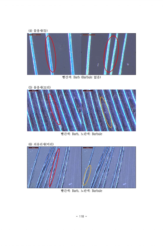 118 4 물총새 등 빨간색Barb Barbule 없음 5 물총새 꼬리 빨간색Barb, 노란색Barbule 6 쇠유리새 머리 빨간색Barb, 노란색Barbule