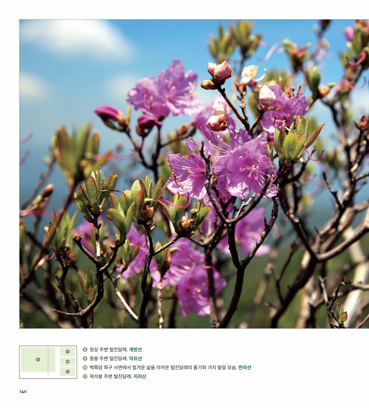 ? ??? ? 정상 주변 털진달래. 계방산 ? 중봉 주변 털진달래. 덕유산 ? 백록담 화구 사면에서 힘겨운 삶을 이어온 털진달래의 줄기와 가지 발달 모습. 한라산 ? 제석봉 주변 털진달래. 지리산140