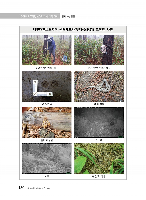 2018 백두대간보호지역 생태계 조사 댓재 삽당령 130 ? National Institute of Ecology 백두대간보호지역 생태계조사 댓재삽당령 포유류 사진 무인센서카메라 설치 무인센서카메라 설치 삵 발자국 삵 배설물 담비배설물 오소리 노루 청설모식흔
