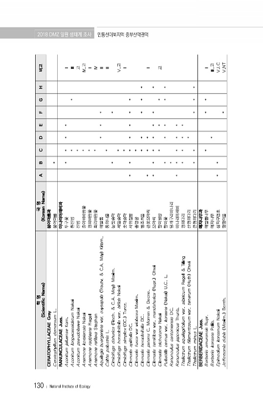 130 ? National Institute of Ecology 학 명 Scientific Name 국 명 Korean Name A B C D E F G H 비고 CERATOPHYLLACEAE Gray 붕어마름과 Ceratophyllum demersum L. 붕어마름 * RANUNCULACEAE Juss. 미나리아재비과 Aconitum jaluense Kom. 투구꽃 * * * * Ⅰ Aconitum longecassidatum Nakai 흰진범 * * Ⅲ Aconitum pseudolaeve Nakai 진범 * 고 Anemone koraiensis Nakai 홀아비바람꽃 * Ⅳ,고 Anemone raddeana Regel 꿩의바람꽃 * Ⅰ Anemone reflexa Stephan 회리바람꽃 * Ⅳ Aqu...