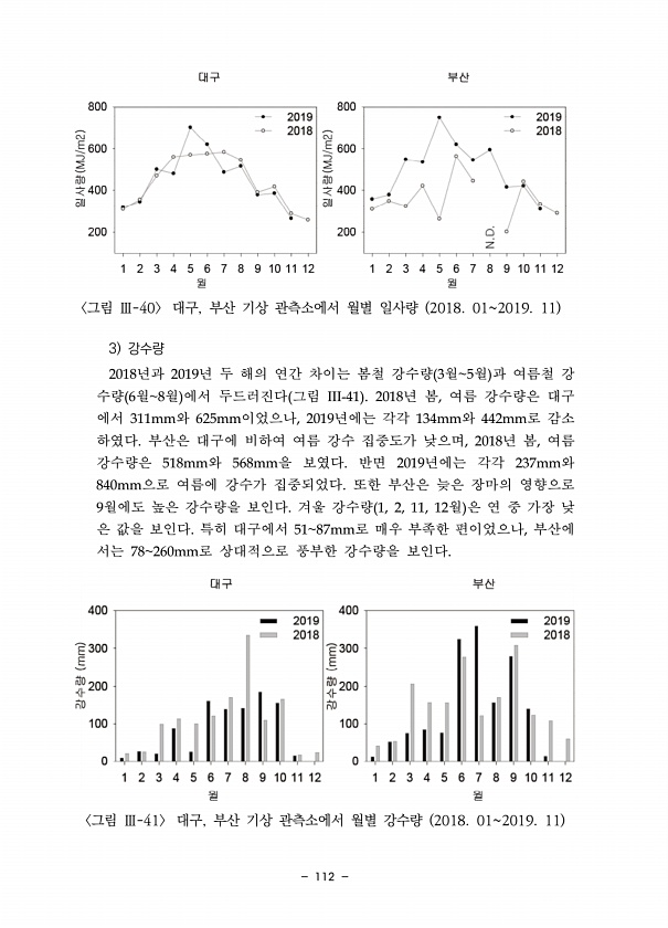 112 그림 Ⅲ-40 대구, 부산 기상 관측소에서 월별 일사량 2018. 012019. 11 3 강수량 2018년과 2019년 두 해의 연간 차이는 봄철 강수량 3월5월 과 여름철 강 수량 6월8월 에서 두드러진다 그림 III-41 2018년 봄, 여름 강수량은 대구 에서 311mm와 625mm이었으나, 2019년에는 각각 134mm와 442mm로 감소 하였다. 부산은 대구에 비하여 여름 강수 집중도가 낮으며, 2018년 봄, 여름 강수량은 518mm와 568mm을 보였다. 반면 2019년에는 각각 237mm와 840mm으로 여름에 강수가 집중되었다. 또한 부산은 늦은 장마의 영향으로 9월에도 높은 강수량을 보인다. 겨울 강수량 1, 2, 11, 12월 은 연 중 가장 낮 은 값을 보인다. 특히 대구에서 5...