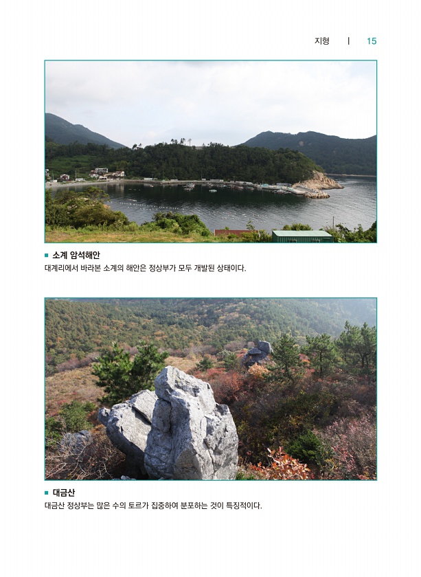 지형 ┃ 15 ■ 소계 암석해안 대계리에서 바라본 소계의 해안은 정상부가 모두 개발된 상태이다. ■ 대금산 대금산 정상부는 많은 수의 토르가 집중하여 분포하는 것이특징적이다.