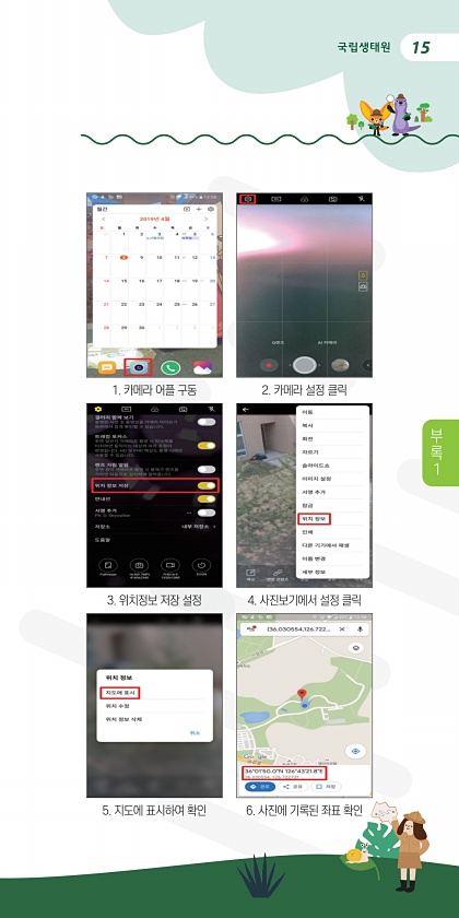 15 1. 카메라 어플 구동 3. 위치정보 저장 설정 5. 지도에 표시하여 확인 2. 카메라 설정 클릭 4. 사진보기에서 설정 클릭 6. 사진에 기록된 좌표 확인 부 록1