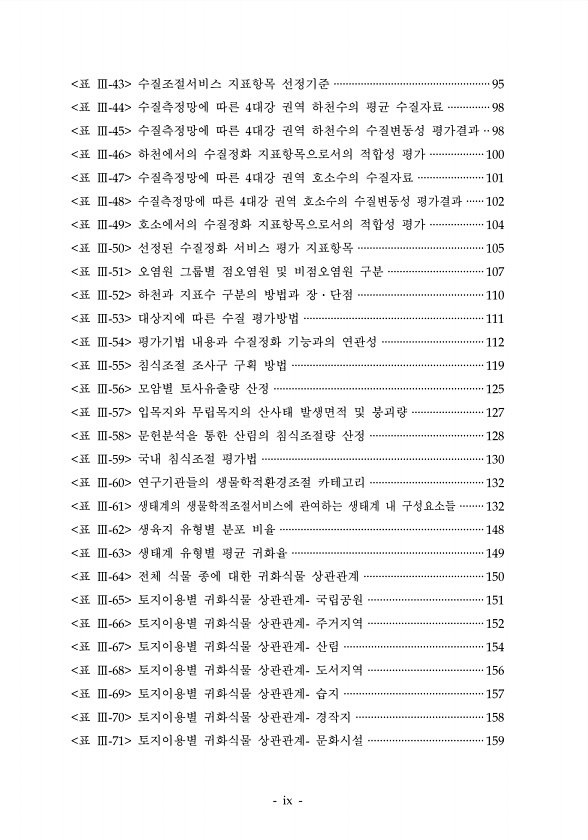 표 수질조절서비스 지표항목 선정기준 표 수질측정망에 따른 대강 권역 하천수의 평균 수질자료 표 수질측정망에 따른 대강 권역 하천수의 수질변동성 평가결과 표 하천에서의 수질정화 지표항목으로서의 적합성 평가 표 수질측정망에 따른 대강 권역 호소수의 수질자료 표 수질측정망에 따른 대강 권역 호소수의 수질변동성 평가결과 표 호소에서의 수질정화 지표항목으로서의 적합성 평가 표 선정된 수질정화 서비스 평가 지표항목 표 오염원 그룹별 점오염원 및 비점오염원 구분 표 하천과 지표수 구분의 방법과 장 단점 표 대상지에 따른 수질 평가방법 표 평가기법 내용과 수질정화 기능과의 연관성 표 침식조절 조사구 구획 방법 표 모암별 토사유출량 산정 표 입목지와 무립목지의 산사태 발생면적 및 붕괴량 표 문헌분석을 통한 산림의 침식조절량...
