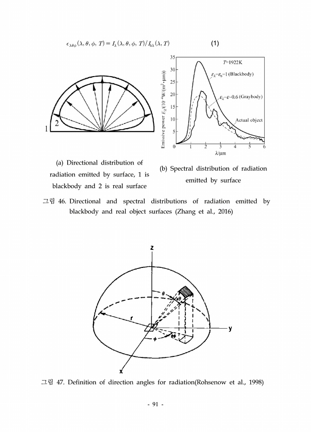 91 ? 1 a Directional distribution of radiation emitted by surface, 1 is blackbody and 2 is real surface b Spectral distribution of radiation emitted by surface 그림 46. Directional and spectral distributions of radiation emitted by blackbody and real object surfaces Zhang et al., 2016 그림 47. Definition of direction angles for radiation Rohsenow et al., 1...