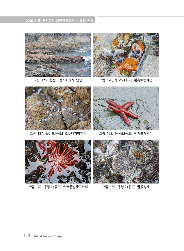 2015 전국 무인도서 자연환경조사 통영 권역 130 ? National Institute of Ecology 그림 125. 동장도 동도 경성 연안 그림 126. 동장도 동도 황록해변해면 그림 127. 동장도 동도 조무래기따개비 그림 128. 동장도 동도 애기불가사리 그림 129. 동장도 동도 띠매끈발갯고사리 그림 130. 동장도 동도말똥성게