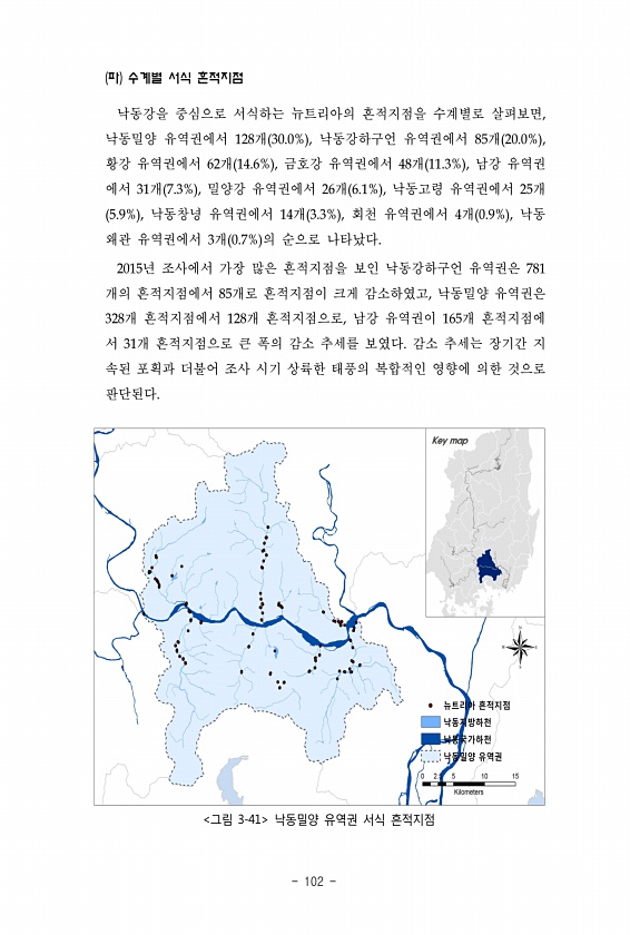 ? 낙동강을 중심으로 서식하는 뉴트리아의 흔적지점을 수계별로 살펴보면, 낙동밀양 유역권에서 128개 30.0% , 낙동강하구언 유역권에서 85개 20.0% , 황강 유역권에서 62개 14.6% , 금호강 유역권에서 48개 11.3% , 남강 유역권 에서 31개 7.3% , 밀양강 유역권에서 26개 6.1% , 낙동고령 유역권에서 25개 5.9% , 낙동창녕 유역권에서 14개 3.3% , 회천 유역권에서 4개 0.9% , 낙동 왜관 유역권에서 3개 0.7% 의 순으로 나타났다. 2015년 조사에서 가장 많은 흔적지점을 보인 낙동강하구언 유역권은 781 개의 흔적지점에서 85개로 흔적지점이 크게 감소하였고, 낙동밀양 유역권은 328개 흔적지점에서 128개 흔적지점으로, 남강 유역권이 165개 흔적지점에 서 31...
