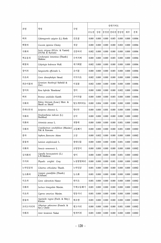 120 과명 학명 국명 상대기여도 수도권 강원 충청권 전라권 경상권 제주 전체 벼과 Calamagrostis epigeios L. Roth 산조풀 0.000 0.000 0.000 0.003 0.000 0.000 0.0004 메꽃과 Cuscuta japonica Choisy 새삼 0.000 0.000 0.000 0.000 0.002 0.000 0.0004 국화과 Ixeris strigosa H.L?v. & Vaniot J.H.Pak & Kawano 선씀바귀 0.002 0.000 0.000 0.000 0.000 0.000 0.0004 벽오동과 Corchoropsis tomentosa Makino Thunb. 수까치깨 0.000 0.000 0.000 0.003 0.000 0.000 0.0004 메꽃과 Calyst...