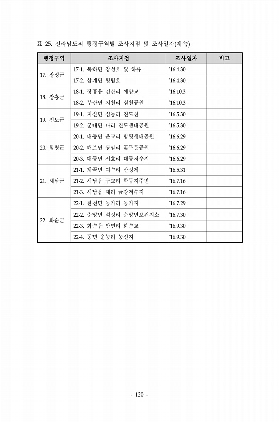 120 표 25. 전라남도의 행정구역별 조사지점 및 조사일자 계속 행정구역 조사지점 조사일자 비고 17. 장성군 17-1. 북하면 장성호 및 하류 ‘16.4.30 17-2. 삼계면 평림호 ‘16.4.30 18. 장흥군 18-1. 장흥읍 건산리 예양교 ‘16.10.3 18-2. 부산면 지천리 심천공원 ‘16.10.3 19. 진도군 19-1. 지산면 심동리 진도천 ‘16.5.30 19-2. 군내면 나리 진도생태공원 ‘16.5.30 20. 함평군 20-1. 대동면 운교리 함평생태공원 ‘16.6.29 20-2. 해보면 광암리 꽃무릇공원 ‘16.6.29 20-3. 대동면 서호리 대동저수지 ‘16.6.29 21. 해남군 21-1. 계곡면 여수리 산정제 ‘16.5.31 21-2. 해남읍 구교리 학동지주변 ‘16.7.16...