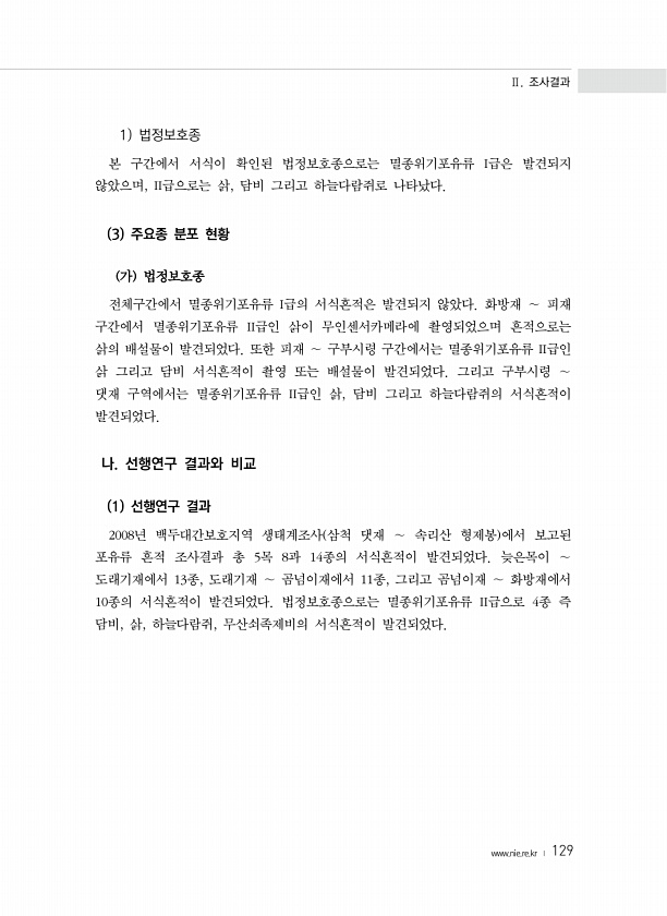 Ⅱ. 조사결과 www.nie.re.kr ? 129 1 법정보호종 본 구간에서 서식이 확인된 법정보호종으로는 멸종위기포유류 I급은 발견되지 않았으며, II급으로는 삵, 담비 그리고 하늘다람쥐로 나타났다. 3 주요종 분포 현황 가 법정보호종 전체구간에서 멸종위기포유류 I급의 서식흔적은 발견되지 않았다. 화방재 ∼ 피재 구간에서 멸종위기포유류 II급인 삵이 무인센서카메라에 촬영되었으며 흔적으로는 삵의 배설물이 발견되었다. 또한 피재 ∼ 구부시령 구간에서는 멸종위기포유류 II급인 삵 그리고 담비 서식흔적이 촬영 또는 배설물이 발견되었다. 그리고 구부시령 ∼ 댓재 구역에서는 멸종위기포유류 II급인 삵, 담비 그리고 하늘다람쥐의 서식흔적이 발견되었다. 나. 선행연구 결과와 비교 1 선행연구 결과 2008년 백두대간보호...