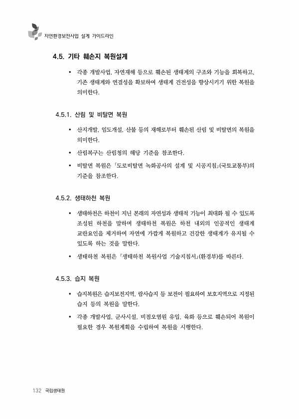132 국립생태원 자연환경보전사업 설계 가이드라인 4.5. 기타 훼손지 복원설계 각종 개발사업, 자연재해 등으로 훼손된 생태계의 구조와 기능을 회복하고, 기존 생태계와 연결성을 확보하여 생태계 건전성을 향상시키기 위한 복원을 의미한다. 4.5.1. 산림 및 비탈면 복원 산지개발, 임도개설, 산불 등의 재해로부터 훼손된 산림 및 비탈면의 복원을 의미한다. 산림복구는 산림청의 해당 기준을 참조한다. 비탈면 복원은 ?도로비탈면 녹화공사의 설계 및 시공지침? 국토교통부 의 기준을 참조한다. 4.5.2. 생태하천 복원 생태하천은 하천이 지닌 본래의 자연성과 생태적 기능이 최대화 될 수 있도록 조성된 하천을 말하며 생태하천 복원은 하천 내외의 인공적인 생태계 교란요인을 제거하여 자연에 가깝게 복원하고 건강한 생태계가 ...