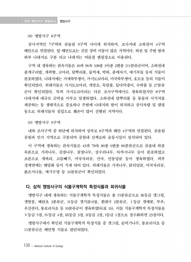 전국 해안사구 정밀조사 맹방사구 130 ? National Institute of Ecology 8 맹방사구 8구역 공사지역인 7구역과 곰솔림 9구역 사이에 위치하며, 조사지내 소하천이 4구역 해안으로 연결된다. 앞 해안도로는 건설 장비 이동이 많은 지역이다. 하천 및 주변 밭과 하부 나대지로 구분 되고 나대지는 여름철 캠핑장소로 이용된다. 구역 내 생육하는 관속식물은 40과 96속 108종 1아종 2변종 111분류군이며, 소하천내 좀개구리밥, 개곽향, 고마리, 달뿌리풀, 물억새, 박하, 좀매자기, 애기부들 등의 식물이 분포하였다. 나대지에는 가새쑥부쟁이, 가시도꼬마리, 미국쑥부쟁이, 호모초 등의 식물이 확인되었다. 외래식물은 가시도꼬마리, 개망초, 독말풀, 들다닥냉이, 수박풀 등 27분류 군이 확인되었다....