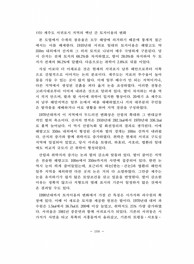108 다 제주도 서귀포시 지역의 백년 간 토지이용의 변화 본 도엽에서 수계의 점유율은 모두 해양에 의거하기 때문에 통계적 접근 에서는 이를 배제한다. 1910년대 서귀포 일대의 토지이용은 해발고도 약 350m 내외에서 산지와 그 외의 토지로 나뉘어 매우 극명하게 구분된다. 당 시 산지는 전체 토지의 68.2%를 차지하였고, 밭이 28.0%를 차지하여 두 토 지가 전체의 96.2%에 달했다. 다음으로는 취락이 2.8%로 뒤를 이었다. 사실 이보다 더 이채로운 것은 현재의 서귀포시 남부 해안으로부터 서쪽 으로 간헐적으로 이어지는 논의 분포이다. 제주도는 지표의 투수율이 높아 물을 가둘 수 있는 곳이 많지 않다. 이에 일부 배수가 안 되는 지역이거나, 다른 지역에서 생성된 진흙을 퍼다 옮겨 논을 조성하였다. 이...