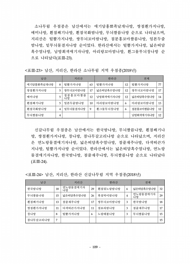 109 남산 지리산 한라산 전체 한국밤나방 18 연노랑물결애기자 나방 29 흰점뒷노랑밤나방 6 넓은띠담흑수염나방 32 무늬짤름나방 15 넓은띠담흑수염나방 26 흑점박이밤나방 4 연노랑물결애기자 나방 29 흰점쐐기나방 13 점줄재주나방 17 쌍무늬꼬마밤나방 3 한국밤나방 18 쌍점흰가지나방 11 다색띠큰가지나방 11 점보라밤나방 3 점줄재주나방 17 창나방 8 털뿔가지나방 6 노랑테불나방 3 무늬짤름나방 15 참나무갈고리나방 7 15 표Ⅲ-24 남산, 지리산, 한라산 신갈나무림 지역 우점종 2018년 소나무림 우점종은 남산에서는 애기담홍뾰족날개나방, 쌍점흰가지나방, 매미나방, 흰점쐐기나방, 흰점국화밤나방, 무늬짤름나방 순으로 나타났으며, 지리산은 털뿔가지나방, 쌍무늬꼬마밤나방, 점분홍꼬마짤름나방, 일본두줄 밤...