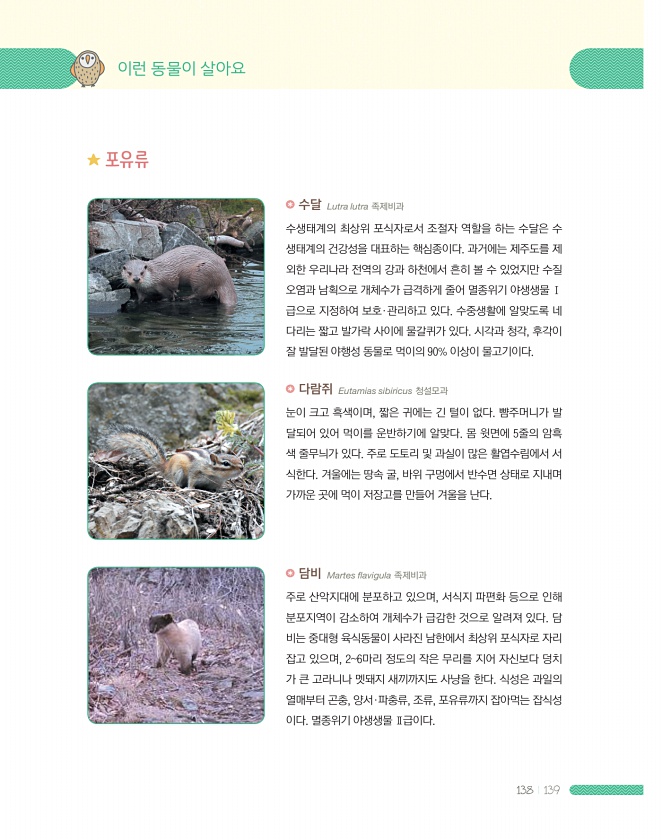138 139 포유류 수달 Lutra lutra 족제비과 수생태계의 최상위 포식자로서 조절자 역할을 하는 수달은 수 생태계의 건강성을 대표하는 핵심종이다. 과거에는 제주도를 제 외한 우리나라 전역의 강과 하천에서 흔히 볼 수 있었지만 수질 오염과 남획으로 개체수가 급격하게 줄어 멸종위기 야생생물Ⅰ 급으로 지정하여 보호·관리하고 있다. 수중생활에 알맞도록 네 다리는 짧고 발가락 사이에 물갈퀴가 있다. 시각과 청각, 후각이 잘 발달된 야행성 동물로 먹이의 90% 이상이 물고기이다. 다람쥐 Eutamias sibiricus 청설모과 눈이 크고 흑색이며, 짧은 귀에는 긴 털이 없다. 뺨주머니가 발 달되어 있어 먹이를 운반하기에 알맞다. 몸 윗면에 5줄의 암흑 색 줄무늬가 있다. 주로 도토리 및 과실이 많은 활엽수림...