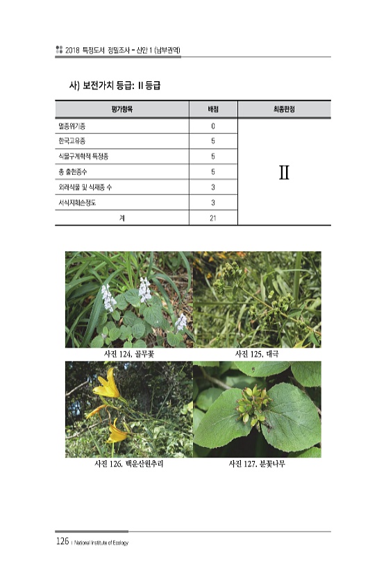 2018 특정도서 정밀조사 신안 1 남부권역 126 ? National Institute of Ecology 평가항목 배점 최종판정 멸종위기종 0 Ⅱ 한국고유종 5 식물구계학적 특정종 5 총 출현종수 5 외래식물 및 식재종 수 3 서식지훼손정도 3 계 21 사진 124. 골무꽃 사진 125. 대극 사진 126. 백운산원추리 사진 127.분꽃나무
