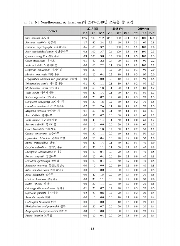 113 17. NI Non-flowering & Intactness 20172019 Species 2017 % 2018 % 2019 % C 1 F 2 IV 3 C 1 F 2 IV 3 C 1 F 2 IV 3 Sasa borealis 87.5 100 51.2 86.8 100 48.4 88.7 100 47.1 Ainsliaea acerifolia 1.7 40 2.4 2.5 60 2.7 3.1 60 2.8 Fraxinus rhynchophylla 0.6 80 3.2 0.8 100 2.7 1.1 100 2.6 Acer pseudosieboldianum 0.2 100 3.7 0.4 100 2.5 0.6 100 2.3 Quercus mongolica 0.3 100 3.8 0.3 100 2.4 0.5 100 2.3 Car...