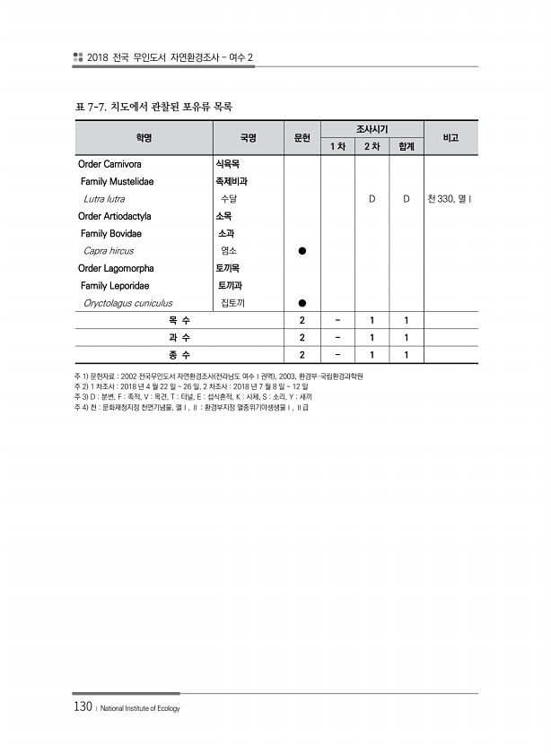 2018 전국 무인도서 자연환경조사 여수 2 130 ? National Institute of Ecology 학명 국명 문헌 조사시기 비고 1 차 2 차 합계 Order Carnivora 식육목 Family Mustelidae 족제비과 Lutra lutra 수달 D D 천 330, 멸Ⅰ Order Artiodactyla 소목 Family Bovidae 소과 Capra hircus 염소 ● Order Lagomorpha 토끼목 Family Leporidae 토끼과 Oryctolagus cuniculus 집토끼 ● 목 수 2 1 1 과 수 2 1 1 종 수 2 1 1 표 7-7. 치도에서 관찰된 포유류 목록 주 1 문헌자료 2002 전국무인도서 자연환경조사 전라남도 여수Ⅰ권역 , 2003, 환경부·국립환경과학원...