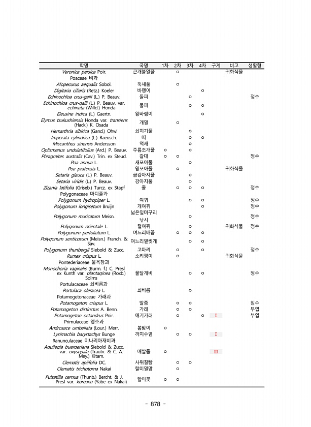 878 학명 국명 1차 2차 3차 4차 구계 비고 생활형 Veronica persica Poir. 큰개불알풀 ㅇ 귀화식물 Poaceae 벼과 Alopecurus aequalis Sobol. 뚝새풀 ㅇ Digitaria ciliaris Retz. Koeler 바랭이 ㅇ Echinochloa crus-galli L. P. Beauv. 돌피 ㅇ 정수 Echinochloa crus-galli L. P. Beauv. var. echinata Willd. Honda 물피 ㅇ ㅇ Eleusine indica L. Gaertn. 왕바랭이 ㅇ Elymus tsukushiensis Honda var. transiens Hack. K. Osada 개밀 ㅇ Hemarthria sibirica Gand. Ohwi 쇠치기풀 ㅇ Im...