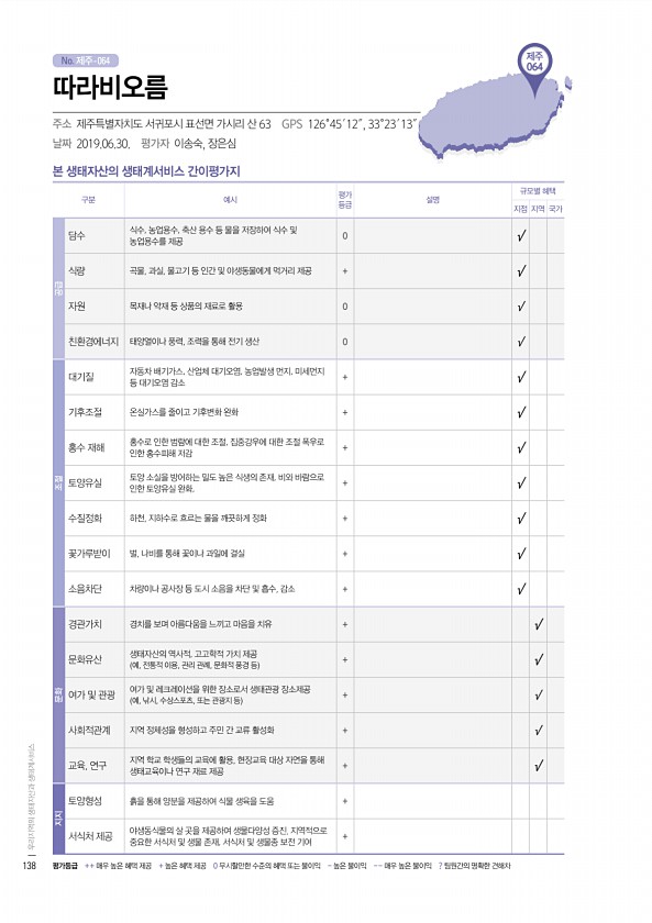 No. 제주- 제주 064 본 생태자산의 생태계서비스 간이평가지 구분 예시 평가 등급 설명 규모별 혜택 지점 지역 국가 공급 담수 식수, 농업용수, 축산 용수 등 물을 저장하여 식수 및 농업용수를 제공 0 √ 식량 곡물, 과실, 물고기 등 인간 및 야생동물에게 먹거리 제공 + √ 자원 목재나 약재 등 상품의 재료로 활용 0 √ 친환경에너지 태양열이나 풍력, 조력을 통해 전기 생산 0 √ 조절 대기질 자동차 배기가스, 산업체 대기오염, 농업발생 먼지, 미세먼지 등 대기오염 감소 + √ 기후조절 온실가스를 줄이고 기후변화 완화 + √ 홍수 재해 홍수로 인한 범람에 대한 조절, 집중강우에 대한 조절 폭우로 인한 홍수피해 저감 + √ 토양유실 토양 소실을 방어하는 밀도 높은 식생의 존재, 비와 바람으로 인한 토양유...