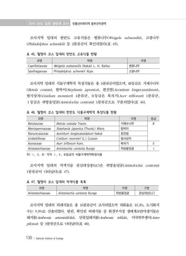 2016 DMZ 일원 생태계 조사 민통선이북지역 동부산악권역 130 ? National Institute of Ecology 조사지역 일대의 한반도 고유식물은 병꽃나무 Weigela subsessilis , 고광나무 Philadelphus schrenkii 등 2분류군이 확인되었다 표 45 표 45. 월명리 코스 일대의 한반도 고유식물 현황 과명 학명 국명 Caprifoliaceae Weigela subsessilis Nakai L. H. Bailey 병꽃나무 Saxifragaceae Philadelphus schrenkii Rupr. 고광나무 조사지역 일대의 식물구계학적 특정식물은 총 6분류군이었으며, Ⅲ등급은 거제수나무 Betula costata , 함박이 Stephania japonica , 흰진범 A...