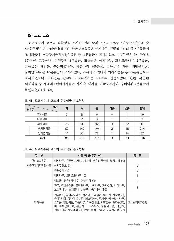 Ⅱ. 조사결과 www.nie.re.kr ? 129 8 토교 코스 토교저수지 코스의 식물상을 조사한 결과 85과 215속 278종 3아종 33변종의 총 314분류군으로 나타났다 표 41 한반도고유종은 매자나무, 큰꽃땅비싸리 등 5분류군이 조사되었다. 식물구계학적특정식물은 총 16분류군이 조사되었으며, Ⅴ등급은 삼지구엽초 1분류군, Ⅳ등급은 큰원추리 1분류군, Ⅲ등급은 매자나무, 꼬리조팝나무 2분류군, Ⅱ등급은 매발톱, 붉은병꽃나무, 하늘나리 3분류군, Ⅰ등급은 관중, 쥐방울덩굴, 물박달나무 등 10분류군이 조사되었다. 조사지역 일대의 외래식물은 총 27분류군으로 조사되었으며, 귀화율은 8.59%, 도시화지수는 8.41%로 산출되었다. 한편, 확인된 외래식물 중 생태계교란야생생물은 가시박, 돼지풀, 미국쑥부쟁이...