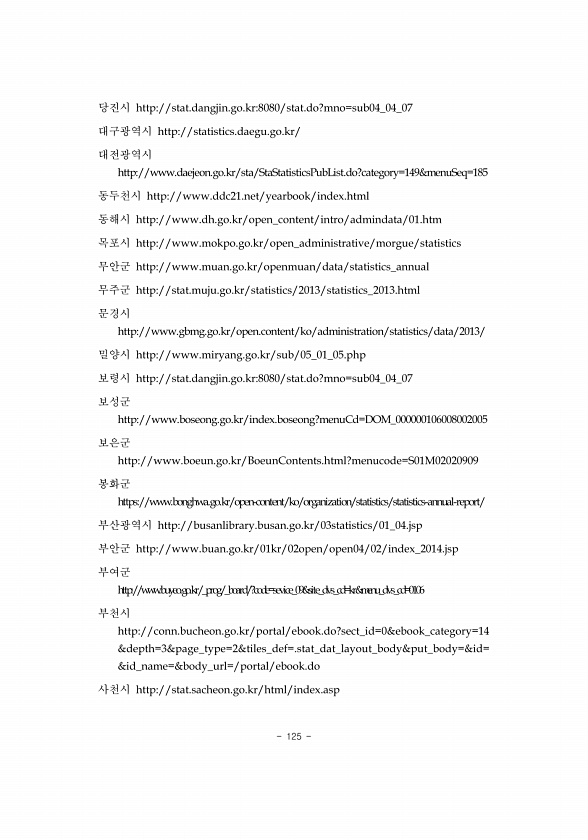125 당진시 http//stat.dangjin.go.kr8080/stat.do?mno=sub04_04_07 대구광역시 http//statistics.daegu.go.kr/ 대전광역시 http//www.daejeon.go.kr/sta/StaStatisticsPubList.do?category=149&menuSeq=185 동두천시 http//www.ddc21.net/yearbook/index.html 동해시 http//www.dh.go.kr/open_content/intro/admindata/01.htm 목포시 http//www.mokpo.go.kr/open_administrative/morgue/statistics 무안군 http//www.muan.go.kr/openmuan/data/statistics_an...