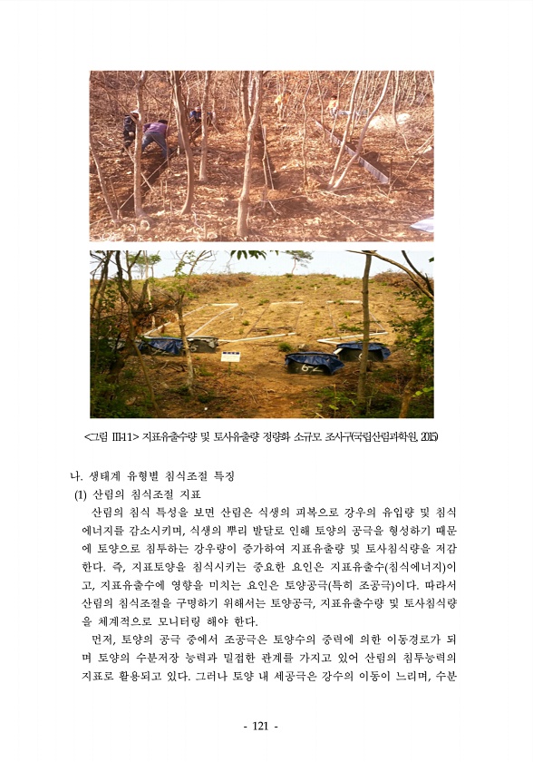 그림 지표유출수량 및 토사유출량 정량화 소규모 조사구 국립산림과학원, 2015 나 생태계 유형별 침식조절 특징 산림의 침식조절 지표 산림의 침식 특성을 보면 산림은 식생의 피복으로 강우의 유입량 및 침식 에너지를 감소시키며 식생의 뿌리 발달로 인해 토양의 공극을 형성하기 때문 에 토양으로 침투하는 강우량이 증가하여 지표유출량 및 토사침식량을 저감 한다 즉 지표토양을 침식시키는 중요한 요인은 지표유출수 침식에너지 이 고 지표유출수에 영향을 미치는 요인은 토양공극 특히 조공극 이다 따라서 산림의 침식조절을 구명하기 위해서는 토양공극 지표유출수량 및 토사침식량 을 체계적으로 모니터링 해야 한다 먼저 토양의 공극 중에서 조공극은 토양수의 중력에 의한 이동경로가 되 며 토양의 수분저장 능력과 밀접한 관계를 가지고 있...