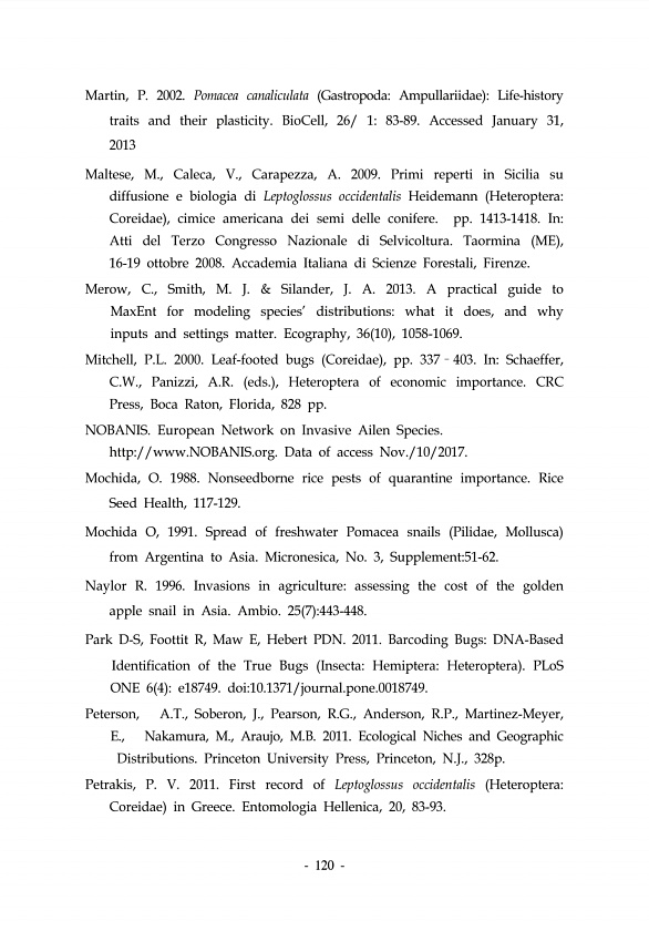 120 Martin, P. 2002. Pomacea canaliculata GastropodaAmpullariidae Life-history traits and their plasticity. BioCell, 26/ 183-89. Accessed January 31, 2013 Maltese, M., Caleca, V., Carapezza, A. 2009. Primi reperti in Sicilia su diffusione e biologia di Leptoglossus occidentalis Heidemann HeteropteraCoreidae , cimice americana dei semi delle conifere. pp. 1413-1418. InAtti del Terzo Congresso Nazio...