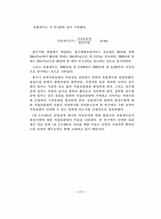470 유출계수는 식 5-10 과 같이 구하였다. 유출계수직접유출량 총강수량 5-10 홍수기에 생태계가 제공하는 홍수재해조절서비스 공급량은 80년대 말에 508.4억㎥에서 90년대 말에는 504.9억㎥으로 약 3.5억㎥ 감소하며, 2000년대 말 에는 503.1억㎥으로 80년대 말 대비 약 5.3억㎥ 감소하는 것으로 분석되었다. 그리고 유출계수는 1980년대 말 0.430에서 2000년대 말 0.436까지 지속적 으로 증가하는 것으로 나타났다. 홍수기 유역저류용량의 적절성을 검토하기 위하여 유출계수를 검증하였다. 총강수량 중에서 증발산량과 옆면차단, 지면저류 등을 제외한 나머지 강수 량의 일부는 지표면 위로 흘러 직접유출량을 형성하게 된다. 그리고 강수량 중에 일부는 토양의 공극을 통하여 흙속으로 ...