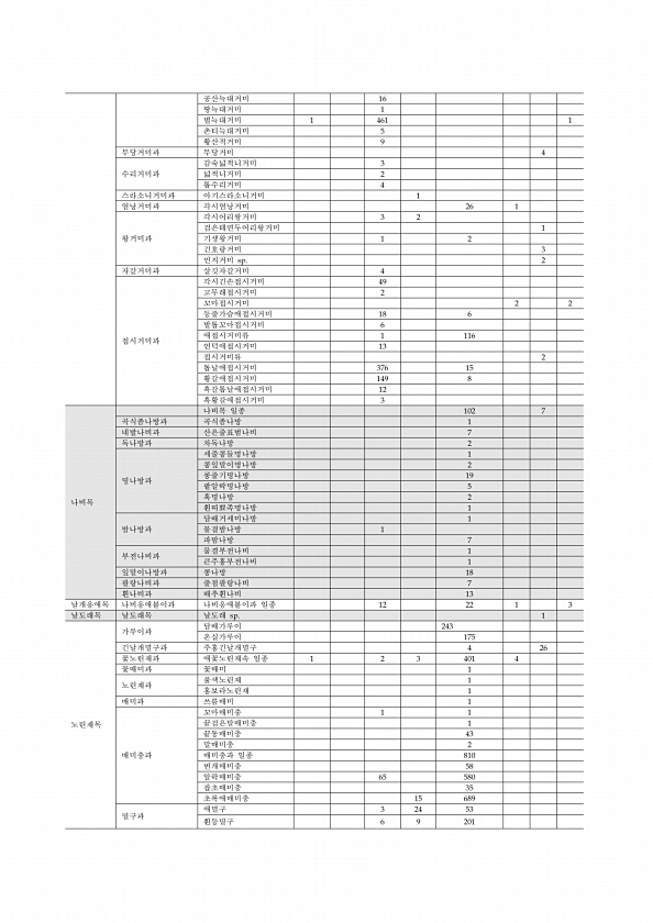 공산늑대거미 16 땅늑대거미 1 별늑대거미 1 461 1 촌티늑대거미 5 황산적거미 9 무당거미과 무당거미 4 수리거미과 감숙넓적니거미 3 넓적니거미 2 톱수리거미 4 스라소니거미과 아기스라소니거미 1 염낭거미과 각시염낭거미 26 1 왕거미과 각시어리왕거미 3 2 검은테연두어리왕거미 1 기생왕거미 1 2 긴호랑거미 3 먼지거미 sp. 2 자갈거미과 살깃자갈거미 4 접시거미과 각시긴손접시거미 49 고무래접시거미 2 꼬마접시거미 2 2 등줄가슴애접시거미 18 6 발톱꼬마접시거미 6 애접시거미류 1 116 언덕애접시거미 13 접시거미류 2 톱날애접시거미 376 15 황갈애접시거미 149 8 흑갈톱날애접시거미 12 흑황갈애접시거미 3 나비목 나비목 일종 102 7 곡식좀나방과 곡식좀나방 1 네발나비과 산은줄표범나비...