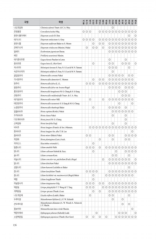 136 나도옥잠화 Clintonia udensis Trautv. & C.A. Mey. ○ 은방울꽃 Convallaria keiskei Miq. ○ ○ ○ ○ ○ ○ ○ ○ ○ ○ ○ ○ ○ ○ ○ 윤판나물아재비 Disporum sessile D. Don ○ ○ 애기나리 Disporum smilacinum A. Gray ○ ○ ○ ○ ○ ○ ○ ○ ○ ○ ○ ○ ○ ○ ○ ○ 윤판나물 Disporum uniforum Baker ex S. Moore ○ ○ ○ ○ ○ ○ ○ ○ ○ ○ ○ ○ 큰애기나리 Disporum viridescens Maxim. Nakai ○ ○ ○ ○ ○ ○ ○ ○ ○ ○ ○ ○ ○ 얼레지 Erythronium japonicum Decne. ○ ○ ○ ○ ○ ○ ○ ○ ○ 패모 Frit...