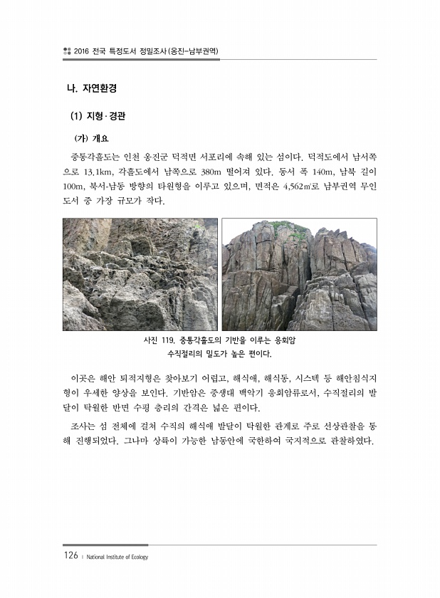 2016 전국 특정도서 정밀조사 옹진-남부권역 126 ? National Institute of Ecology 나. 자연환경 1 지형 ? 경관 가 개요 중통각흘도는 인천 옹진군 덕적면 서포리에 속해 있는 섬이다. 덕적도에서 남서쪽 으로 13.1km, 각흘도에서 남쪽으로 380m 떨어져 있다. 동서 폭 140m, 남북 길이 100m, 북서-남동 방향의 타원형을 이루고 있으며, 면적은 4,562㎡로 남부권역 무인 도서 중 가장 규모가 작다. 사진 119. 중통각흘도의 기반을 이루는 응회암 수직절리의 밀도가 높은 편이다. 이곳은 해안 퇴적지형은 찾아보기 어렵고, 해식애, 해식동, 시스텍 등 해안침식지 형이 우세한 양상을 보인다. 기반암은 중생대 백악기 응회암류로서, 수직절리의 발 달이 탁월한 반면 수평 층리의 간...