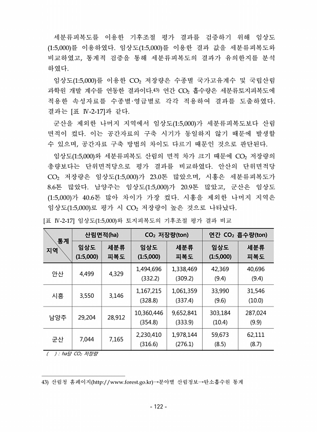 세분류피복도를 이용한 기후조절 평가 결과를 검증하기 위해 임상도 15,000 를 이용하였다. 임상도 15,000 를 이용한 결과 값을 세분류피복도와 비교하였고, 통계적 검증을 통해 세분류피복도의 결과가 유의한지를 분석 하였다. 임상도 15,000 를 이용한 CO2 저장량은 수종별 국가고유계수 및 국립산림 과학원 개발 계수를 연동한 결과이다.43 연간 CO2 흡수량은 세분류토지피복도에 적용한 속성자료를 수종별·영급별로 각각 적용하여 결과를 도출하였다. 결과는 [표 Ⅳ-2-17]과 같다. 군산을 제외한 나머지 지역에서 임상도 15,000 가 세분류피복도보다 산림 면적이 컸다. 이는 공간자료의 구축 시기가 동일하지 않기 때문에 발생할 수 있으며, 공간자료 구축 방법의 차이도 다르기 때문인 것으로 판단된다. 임상도...