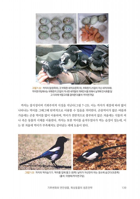 기후변화와 연안생물, 육상동물의 생존전략 139 까치는 잡식성이며 기회주의적 식성을 지닌다 그림 7-23 이는 까치가 계절에 따라 많이 나타나는 먹이를 그때그때 탄력적으로 이용할 수 있음을 의미한다. 곤충먹이가 많은 여름과 가을에는 곤충 먹이를 많이 이용하며, 먹이가 전반적으로 풍부하지 않은 겨울에는 식물의 씨 나 죽은 동물의 시체를 이용한다. 까치는 또한 먹이를 숨겨두었다가 먹는 습성이 있는데, 이 는 한 겨울에 먹이가 부족해져도 살아남는 데에 도움이 된다. 그림7-22 까치의 알 왼쪽위 , 갓 부화한 새끼 오른쪽 위 , 부화한지 25일이 지난 새끼 아래 까치연구팀에서는 부화한지 25일이 지나면 새끼들의 개체인식을 위해서 날개에 인식표를 달 고 다리에 색깔고리를 걸어준다 출처까치연구팀 그림7-23 까치의 ...