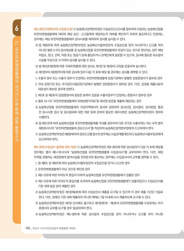 140 _ 환경부 유전자변형생물체 안전관리 가이드 6 유전자변형생물체의 국가간 이동 등에 관한 통합고시 2 제3-28조 국경에서의 수입검사 등 ① 농림축산검역본부장은 수입승인 신고 서를 첨부하여 수입하는 농림축산업용 유전자변형생물체에 대하여 해당 승인·신고품목에 해당되는지 여부를 확인하기 위하여 필요하다고 인정되는 경우에는 해당 유전자변형생물체의 검사시료를 채취하여 검사를 실시할 수 있다. ② 법 제36조에 따라 농림축산검역본부장은 농림축산식품부장관의 수입승인을 얻지 아니하거나 신고를 하지 아니한 별표 3-2의 검사대상품 및 농림축산업용 유전자변형생물체의 유입이 있는 것으로 판단되는 경우 해당 저장소, 창고, 선박, 차량 또는 항공기 등에 출입하거나 관계인에게 질문할 수 있으며, 검사에 필요한 최소량의 시료...