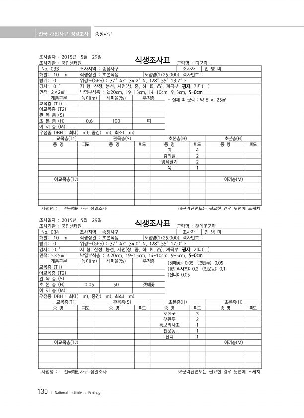 전국 해안사구 정밀조사 송정사구 130 ? National Institute of Ecology 조사일자 2015년 5월 29일 조사기관 국립생태원 식생조사표 군락명 띠군락 No. 033 조사지역 송정사구 조사자 민 병 미 해발10 m 식생상관 초본식생 도엽명 1/25,000 , 격자번호 방위0 위경도 GPS 37°47′34.2″N, 128°55′13.7″E 경사0 ° 지 형산정, 능선, 사면 상, 중, 하, 凹, 凸 , 계곡부, 평지, 기타 면적2×2㎡ 낙엽부식층 ≥20cm, 19-15cm, 14-10cm, 9-5cm, 5-0cm 계층구분 높이 m 식피율 % 우점종 실제 띠 군락 약 8 × 25㎡ 교목층 T1 아교목층 T2 관 목 층 S 초 본 층 H 0.6 100 띠 이 끼 층 M 우점종 DBH 최대 m...