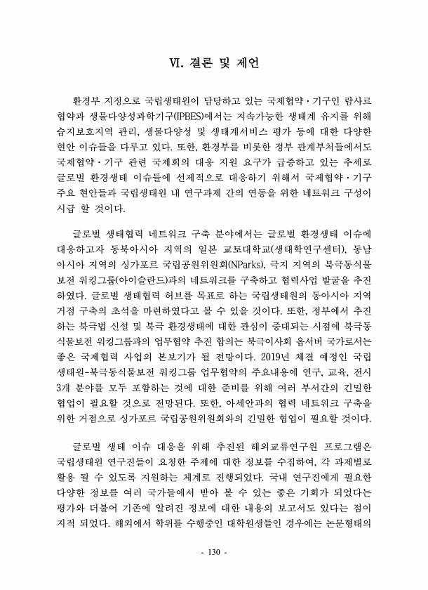 130 Ⅵ. 결론 및 제언 환경부 지정으로 국립생태원이 담당하고 있는 국제협약·기구인 람사르 협약과 생물다양성과학기구 IPBES 에서는 지속가능한 생태계 유지를 위해 습지보호지역 관리, 생물다양성 및 생태계서비스 평가 등에 대한 다양한 현안 이슈들을 다루고 있다. 또한, 환경부를 비롯한 정부 관계부처들에서도 국제협약·기구 관련 국제회의 대응 지원 요구가 급증하고 있는 추세로 글로벌 환경생태 이슈들에 선제적으로 대응하기 위해서 국제협약·기구 주요 현안들과 국립생태원 내 연구과제 간의 연동을 위한 네트워크 구성이 시급 할 것이다. 글로벌 생태협력 네트워크 구축 분야에서는 글로벌 환경생태 이슈에 대응하고자 동북아시아 지역의 일본 교토대학교 생태학연구센터 , 동남 아시아 지역의 싱가포르 국립공원위원회 NParks ...