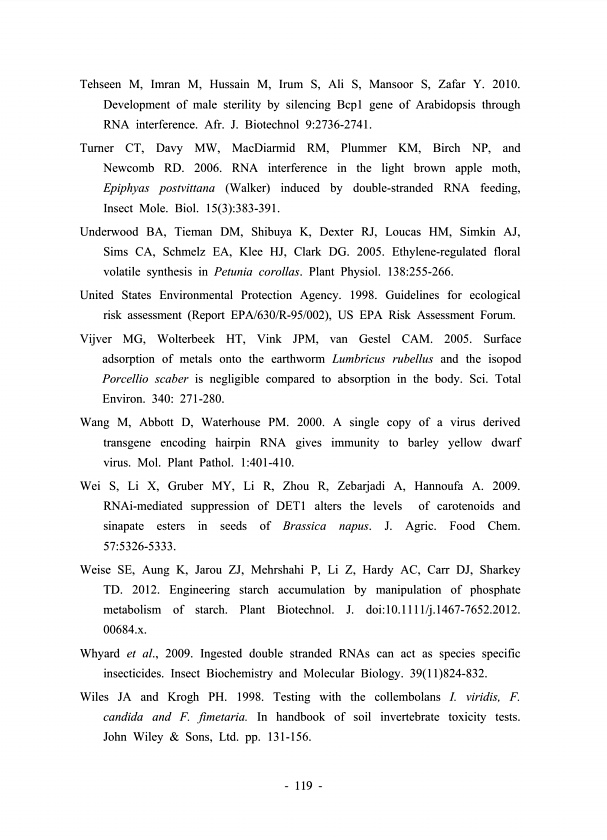 119 Tehseen M, Imran M, Hussain M, Irum S, Ali S, Mansoor S, Zafar Y. 2010. Development of male sterility by silencing Bcp1 gene of Arabidopsis through RNA interference. Afr. J. Biotechnol 92736-2741. Turner CT, Davy MW, MacDiarmid RM, Plummer KM, Birch NP, and Newcomb RD. 2006. RNA interference in the light brown apple moth, Epiphyas postvittana Walker induced by double-stranded RNA feeding, Inse...
