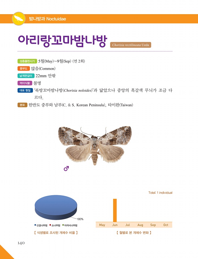 140 밤나방과 Noctuidae 성충출현시기 5월 May 9월 Sep 연 2회 풍부도 많음 Common 날개편길이 22mm 안팎 먹이식물 불명 대표 형질 ‘북방꼬마밤나방 Chorisia noloides ’과 닮았으나 중앙의 흑갈색 무늬가 조금 다 르다. 분포 한반도 중부와 남부 C. & S. Korean Peninsula , 타이완 Taiwan 아리랑꼬마밤나방 Chorisia rectilineata Ueda 【 월별로 본 개체수 변화 】 Total1 individual May Jun Jul Aug Sep Oct 【 식생별로 조사된 개체수 비율 】 100% 신갈나무림 소나무림아까시나무림