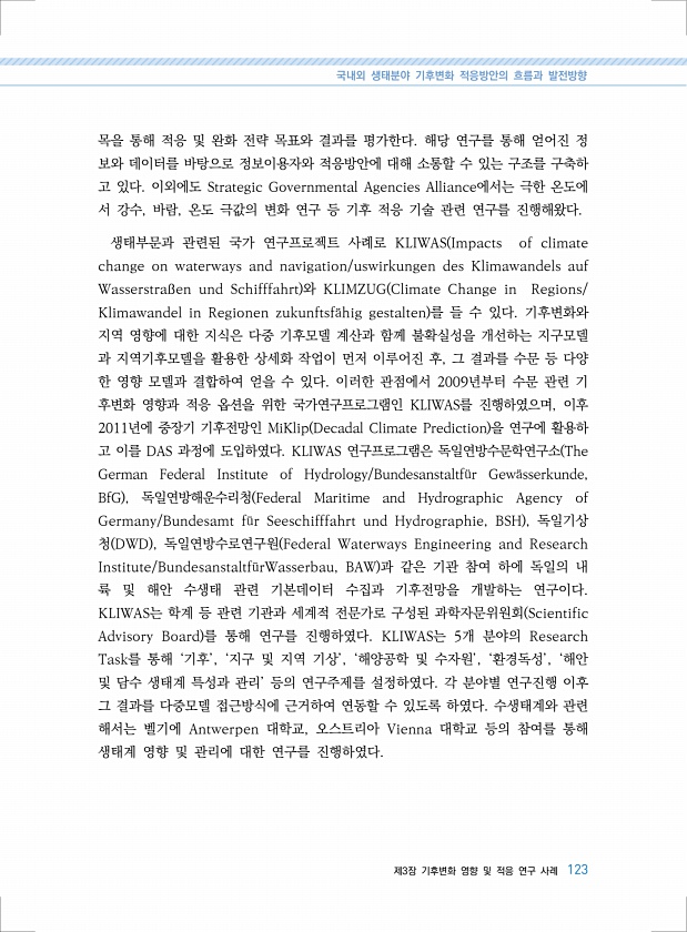 국내외 생태분야 기후변화 적응방안의 흐름과 발전방향 제3장 기후변화 영향 및 적응 연구 사례 123 목을 통해 적응 및 완화 전략 목표와 결과를 평가한다. 해당 연구를 통해 얻어진 정 보와 데이터를 바탕으로 정보이용자와 적응방안에 대해 소통할 수 있는 구조를 구축하 고 있다. 이외에도 Strategic Governmental Agencies Alliance에서는 극한 온도에 서 강수, 바람, 온도 극값의 변화 연구 등 기후 적응 기술 관련 연구를 진행해왔다. 생태부문과 관련된 국가 연구프로젝트 사례로 KLIWAS Impacts of climate change on waterways and navigation/uswirkungen des Klimawandels auf Wasserstraßen und Schif...