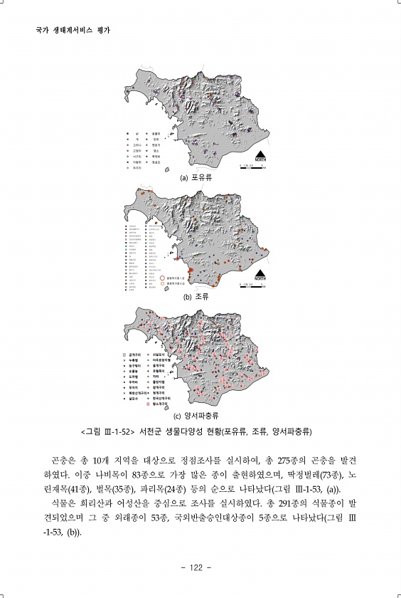 국가 생태계서비스 평가 122 a 포유류 b 조류 c 양서파충류 그림 Ⅲ-1-52 서천군 생물다양성 현황 포유류, 조류, 양서파충류 곤충은 총 10개 지역을 대상으로 정점조사를 실시하여, 총 275종의 곤충을 발견 하였다. 이중 나비목이 83종으로 가장 많은 종이 출현하였으며, 딱정벌레 73종 , 노 린재목 41종 , 벌목 35종 , 파리목 24종 등의 순으로 나타났다 그림 Ⅲ-1-53, a 식물은 희리산과 어성산을 중심으로 조사를 실시하였다. 총 291종의 식물종이 발 견되었으며 그 중 외래종이 53종, 국외반출승인대상종이 5종으로 나타났다 그림 Ⅲ -1-53, b