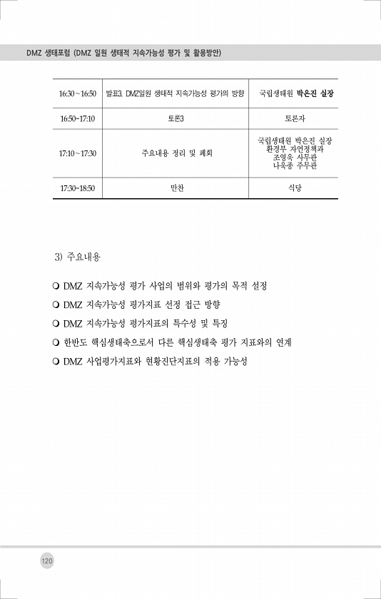 DMZ 생태포럼 DMZ 일원 생태적 지속가능성 평가 및 활용방안 120 3 주요내용 m DMZ 지속가능성 평가 사업의 범위와 평가의 목적 설정 m DMZ 지속가능성 평가지표 선정 접근 방향 m DMZ 지속가능성 평가지표의 특수성 및 특징 m 한반도 핵심생태축으로서 다른 핵심생태축 평가 지표와의 연계 m DMZ 사업평가지표와 현황진단지표의 적용 가능성 1630∼1650 발표3. DMZ일원 생태적 지속가능성 평가의 방향 국립생태원 박은진 실장 16501710 토론3 토론자 1710∼1730 주요내용 정리 및 폐회 국립생태원 박은진 실장 환경부 자연정책과 조영욱 사무관 나욱종 주무관 17301850 만찬식당